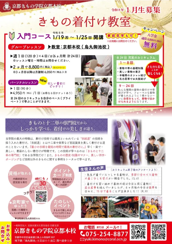 自分で着物を着られるようになる!「入門コース」 1月生入学募集!【烏丸御池校(京都)】